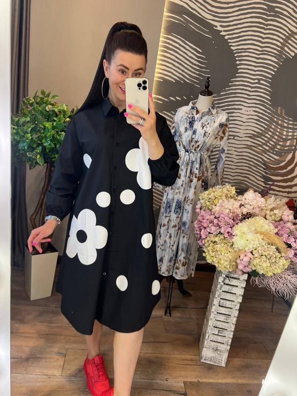 стильно, удобно и красиво так можно описать очаровательное платье свободного кроя с длинными рукавами на резинке внизу, небольшим отложным воротником, удобными карманами, на пуговицах спереди и фигурным низом (по бокам небольшие вырезы), выполненную из высококачественного полированного коттона классических цветов, украшенных контрастной цветочной термонаклейкой. оно выглядит потрясающе, безупречно садится на разные типы фигур и легко комбинируется с обувью и аксессуарами разных цветов и стилей размер оверсайз 46-50 длина 108-110 см, п г 56-57 см, длина рукава от шеи 69-70 см