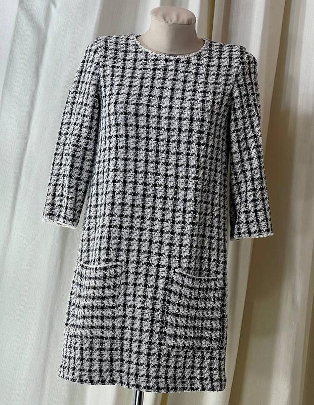 Сукня жіноча букле-клітинка чорно-білого кольору ZARA TRF🛍️❤️🔥 Розмір - UK 8/ EUR 36/ MEX 26/ S / 42-44. Склад : 12% акрил, 6% віскоза, 56% бавовна, 26% поліестер . Підкладка : 100% поліестер . Виробник Морокко. Сукня міні прямого вільного крою з букле , на еластичній підкладці. Круглий виріз горловини з металевою короткою змійкою ззаду. Рукав 3/4. Накладні кармани переду . Додаткові заміри: повна довжина 82 см , ширина плечей 36 см, довжина рукава 45 см, напівобхват грудей 46 см (повний обхват 92 см), напівобхват талії 46 см (повний обхват 92 см), напівобхват стегон 50 см (повний обхват 100 см) .