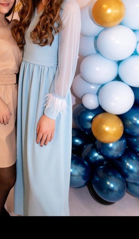 Красивое платье голубенького цвета, на рукавах перья. Также есть пояс из такой же ткани. Одягала один раз. Мой рост 170см. вес 55 кг.