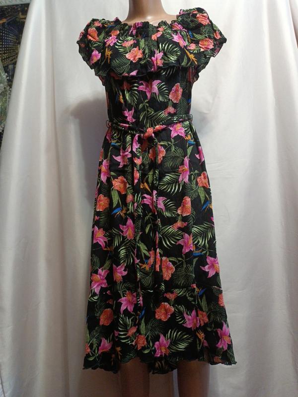 Легка тканина жатка. На плечах резинка с рюшей. Знизу рюша. Спереди короче, сзади дольше. Талия на поческе