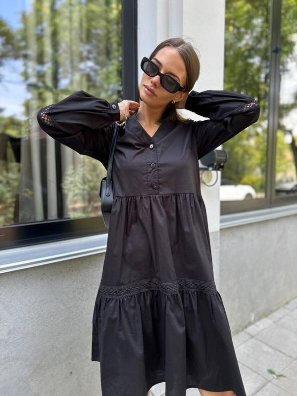Сукня Арт. SV 455 Ткань: 100% котон(бавовна) Цвет: черный Размеры: S, M, L, XL Цена : 1200грн Описание: Платье-трапеция из натурального коттона свободного кроя. Модель с V-образным вырезом, рукава и воланы декорированы кружевом.Можна сочетать с разными стилями.