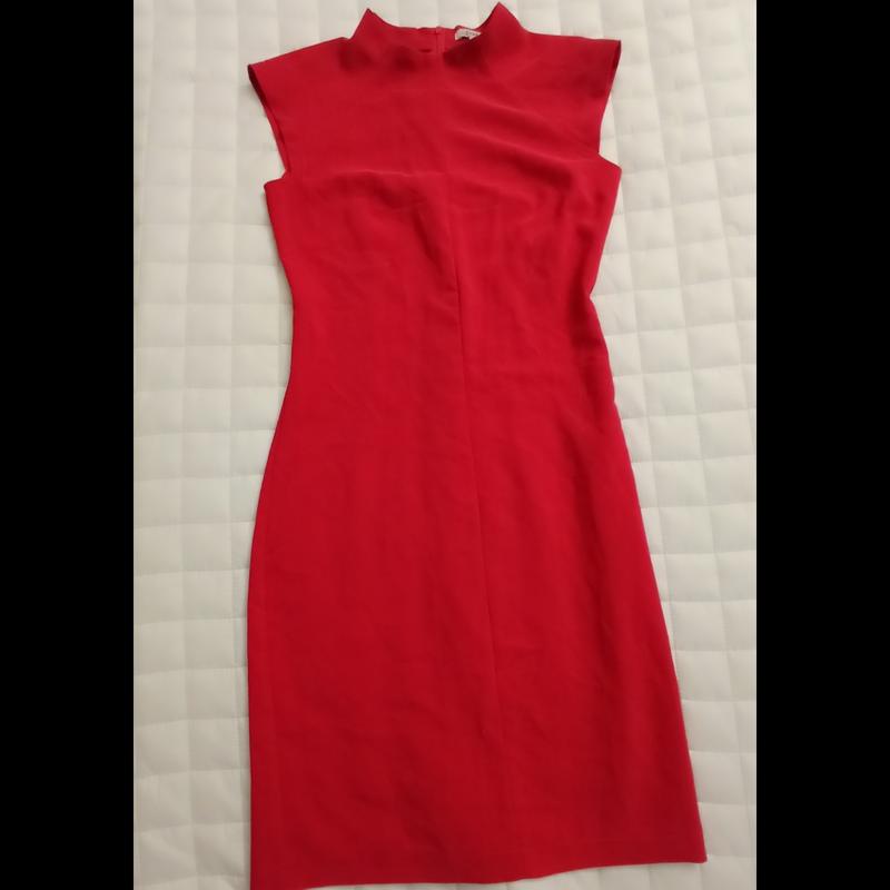 платье красного цвета.теань переходит в воротник стойку 3- см.без шва.сзади длинная змейка.внутри ворота два веревки капроновых для подвески платья приталенное состояние хорошее+. отдельный где катышек...просмотрел все нормально.тянится вовсе стороны.на груди выточки.размер 36. замеры:44- плечи*42.5 грудь*97- длина*17- рукава проем.* 43- низ* талия-35.5 см