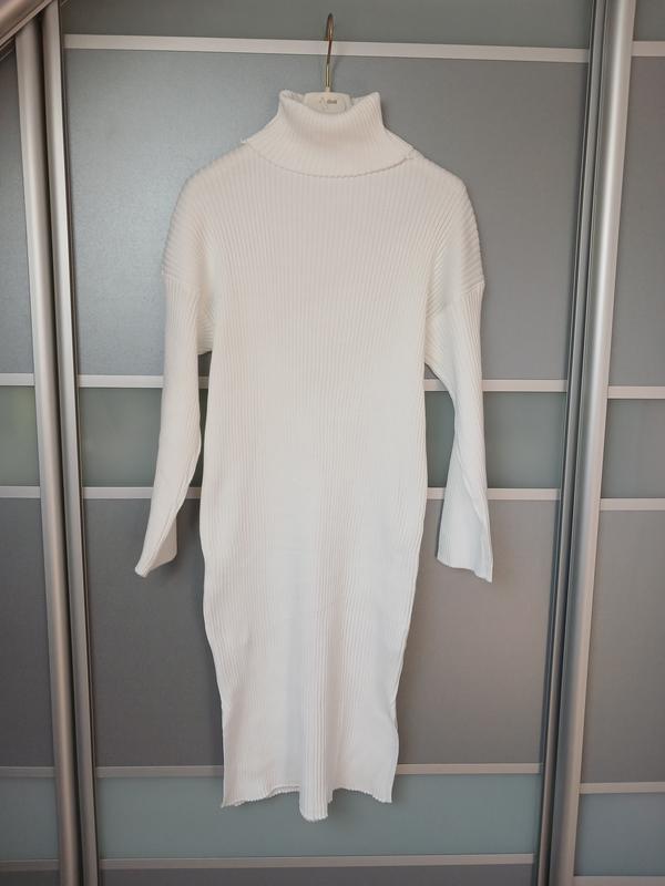 Платье трикотаж, по бокам внизу разрезы не величицы 19см. Стан - идеэлье. Размер не указан, бирки нет. Замеры: плечи от горловины 22см, рукав опущенный 42, пог 48, пот 40, длина 97. Платье тянется!