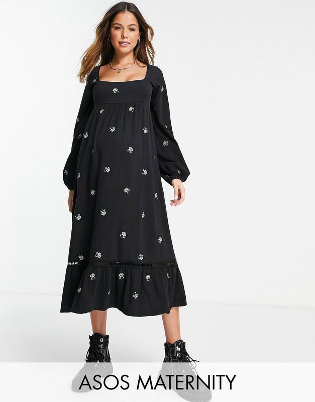 Черное платье миди с квадратным вырезом и цветочной вышивкой по всей поверхности ASOS DESIGN Maternity