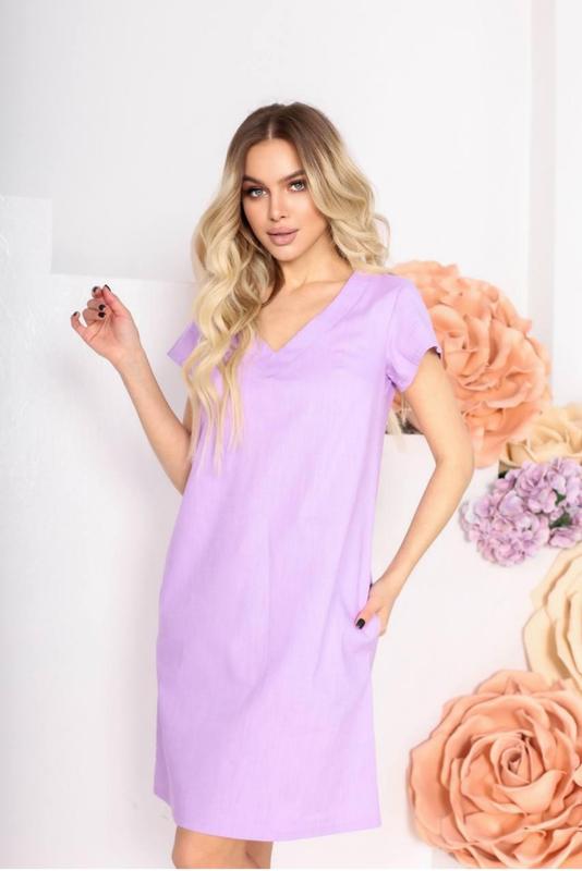 Жіноча сукня бузкового кольору. тканина: полотно льону. Розмір 46-48 тягнеться але в міру. Є кишені. До сукні є пасок.