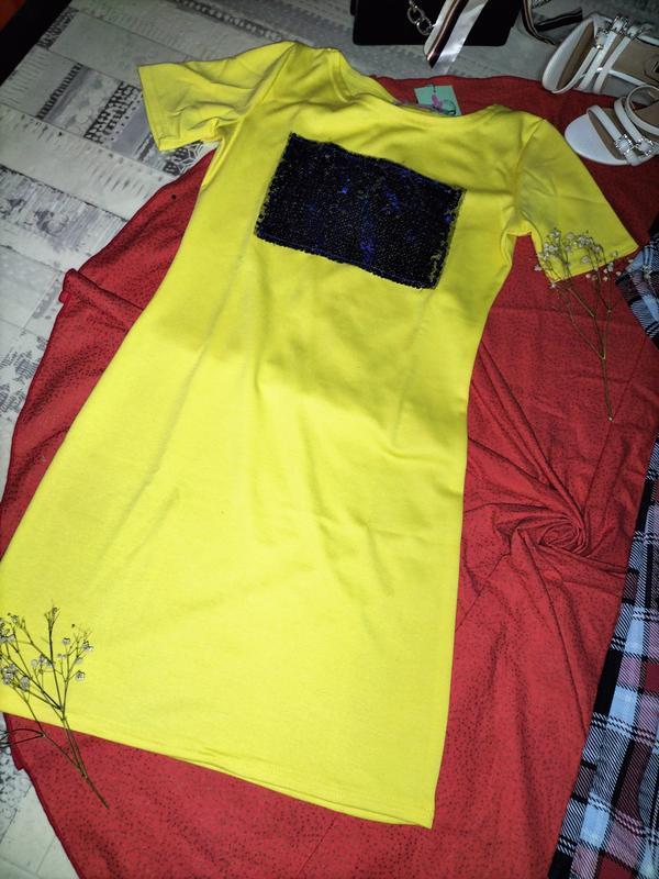 Тип одягу: Плаття Сукня з паєтками (м'якенька приємна тканина) ✓нова ✓колір- жовтий(паєтки-сині) ✓розмір 42-44 ОГ 82-92 ОТ 72-82 ОБ 84-94 Довжина 81 Довжина рукава 20📏