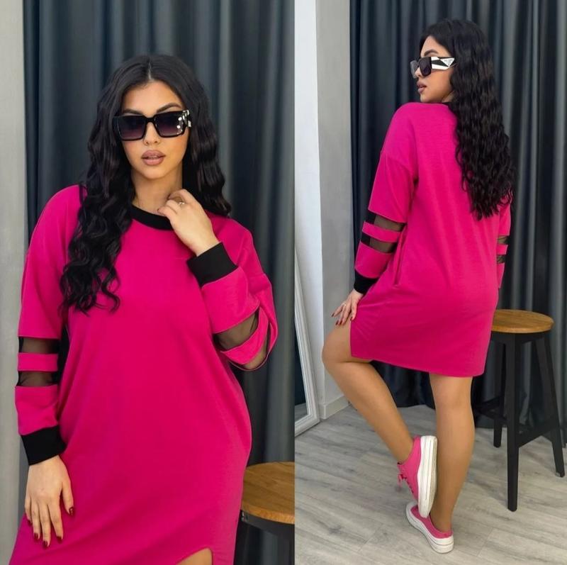MBS - 2 Модель 124 Ткань: двунитка высшего качества Размер: 48-50, 52-54, 56-58 Цвет: малина, черный, молоко Стильное платье выполненное из качественной двухнити, не скатывается, приятное на ощупь. Рукав украшен сеткой. Универсальная модель, подойдет под любую обувь. Замеры: 48-50 Груди 114 см Стегна 114 см Длина изделия 91 см Длина рукава 70 см 52-54 Груди 120 см Стегна 122 см Длина изделия 91 см Длина рукава 70 см 56-58 Груди 124 см Стегна 128 см Длина изделия 91 см Длина рукава 70 см