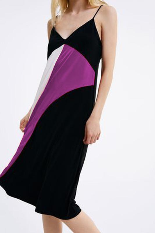 Тип одягу: Плаття Стильне ефектне триколірне плаття на тонких бретелях-спагетті від бренду ZARA. Тканина дуже добре тягнеться. При бажанні можна під низ одягнути обтягуючий футболку (принаймні на офіційному сайті були представлені такі фото даної моделі в поєднанні з футболкою). Розмір вказано L. Заміри: ПОГ 46 см (тягнеться до 56 см) ПОБІДИ 58 см Довжина від плеча до низу 88 см Склад: 96% поліестер, 4% еластан.