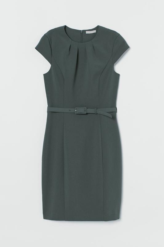 Тип одягу: Плаття Коротке обтисле плаття з еластичної тканини з короткими рукавами від бренда H&M. Складки спереду на вирізі горловини, застібка на блискавку ззаду. Знімний ремінь із металевою обтягнутою тканиною пряжкою на талії, розріз ззаду. Усередині підкладка. Заміри: НОГ 45 см (тягнеться до 48 см) ПОТ 39 см НОС 49 см (до 52 см) Плечі 37 см Довжина від плеча до низу 92 см Склад: 76% поліестер, 17% віскоза, 7% еластан; підкладка: 100% поліестер. Річ нова, без паперової бирки.