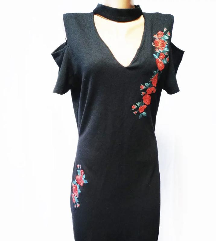 Нарядное платье с вышивкой. С открытыми плечами и саппером на шее. Выполнено из качественного трикотажа. Состав ткани 55% вискоза, 40% полиэфир, 5% эластан.