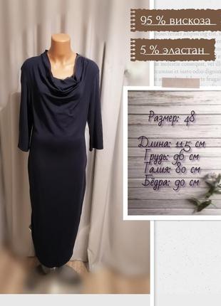 Трикотаж темно-синього кольору. Тонкий, як у футболках. Добре тягнеться. Довжина за коліно. Жіночне декольте. Гарно дивиться з палантином або ж елегантною безрукавкою.