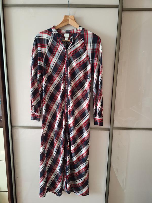 Платье- рубашка в клетку фирмы H&M. Размер 38. Застегивается на пуговицы, имеет воротник-стойку. На длинный рукав с манжетами. Материал вискоза. Без пояса. Длина 125 см.