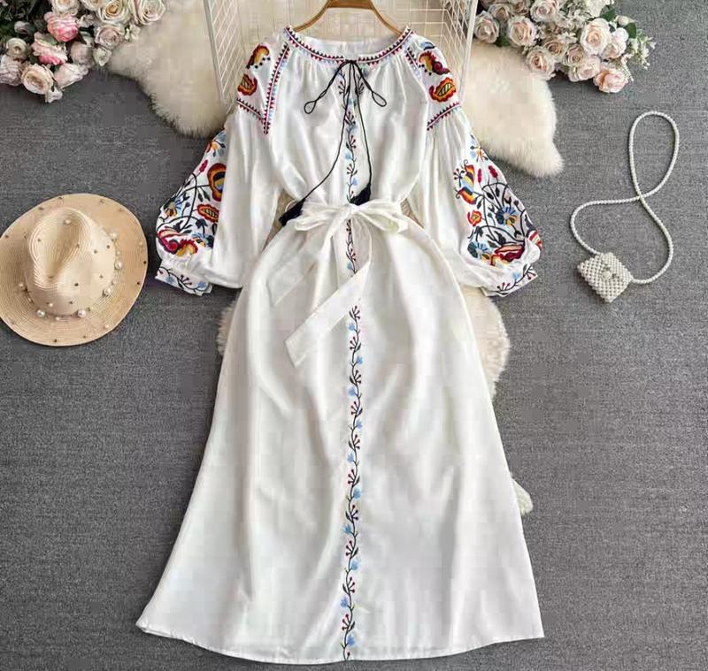 Красивое платье с этнической вышивкой, под пояс. Рукава фонариком, длина -миди. Цвет - белый. Размер-универсальный(s,m,l) полуобхват груди 52 -талия под пояс -длина 119 -тканина льон