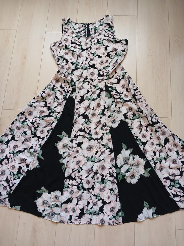 Платье летнее с цветами без рукавов, отрезное по талии, клешная юбка с контрастными вставками. Легкая, воздушная, в юбке есть по бокам разрезы, сзади молния. Замеры: Длина 117 от проймы до проймы 50 по талии 47