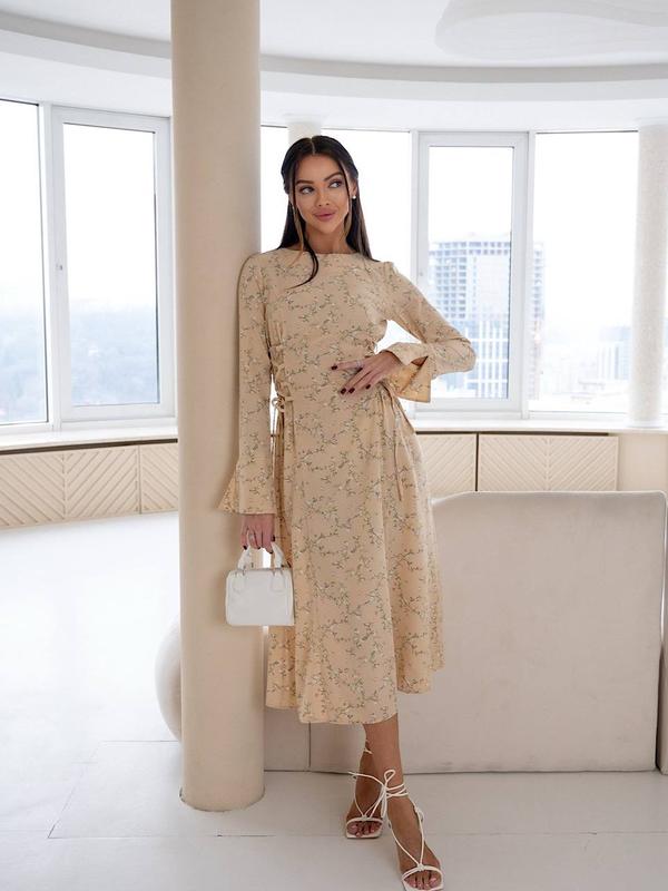 Плате миди в цветочный принт со шнуровкой на талии с длинными рукавами клёш а силуэта элег...