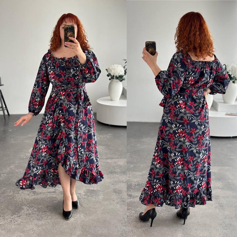 Сукня Код 3641 Тканина: софт. Цвета: синий, лиловый. Размеры: 52-54, 56-58, 60-62, 64-66. Длина платья: 125/130, 125/130, 125/130, 125/130 см. Длина рукава: 60, 60, 60, 60, 60 см. Обхват рукава: 50, 51, 52, 53 см. Замеры готового изделия: 52-54 ОГ 114 ОТ 106 ОС 130 56-58 ОГ 122 ОТ 114 ОС 140 60-62 ОГ 130 ОТ 122 ОС 150 64-66 ОГ 138 ОТ 130 ОС 160 Невероятно красивое длинное платье в вечернем стиле. Лиф платья собран на резинку, можно спускать на плече, впереди декоративная завязка. Рукав длинный, по низу собран на резинку. Платье по линии талии отрезное. Юбка платья с имитацией запаха. украшена воланом. В боковых швах обработаны карманы. Пояс из основной ткани в комплекте. Платье идеально подойдет для торжественных событий, весилль, юбилеев и т.д.