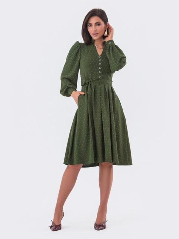 ‼️Отправка в течение 1-5 рабочих дней. Платье расклешенного кроя из ткани Ролекс. С V-образным вырезом горловины и длинными рукавами с широкими манжетами. Модель с рядом декоративных пуговиц на лифе. Пышная юбка выполнена со складками. Застегивается на молнию по спинке. Пояс у комплекті. Арт. 45640 Размеры: 42, 44, 46, 48, 50. Цвет: голубой, хаки.