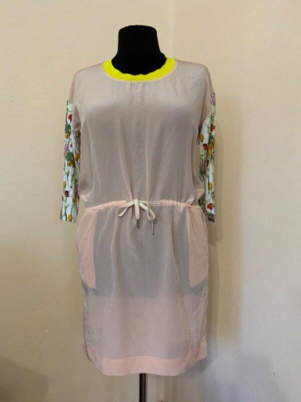 Виробник: Інший виробник Тип одягу: Плаття Плаття з шовку персикового кольору, нове, від ярлика лише тримач пластиковий лишився, ярлик зі складниками теж відсутній. Довжина- 91 см, плечі приспущені -54см, рукав від плеча- -36см, пог- 55см, до низу пряме, є бокові кишені, талія регулюється . Рукава з трикотажу віскозного .