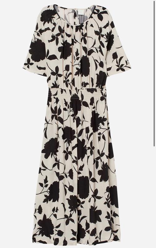Платье миди из воздушной вискозной ткани. Круглый вырез и декоративная сборка по горловине. Разрез сзади с пуговицей у горловины. Широкие рукава реглан длиной до локтя. На талии резинка. Без подкладки. Размер по набору указан S, но фото модели размером L (XL)