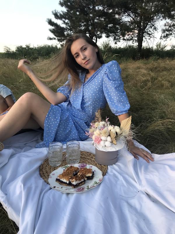 Легенька сукня на запах Размер можно регулировать На талию до полу обх. 48 см Длина 115 см Длина рукава 36 см Плечи 37 см