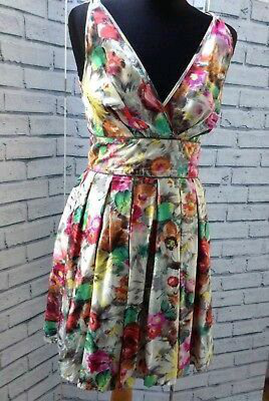 Виробник: Інший виробник Тип одягу: Плаття Неймовірно гарне, легке літнє плаття, виконане з 100% шовку. Шовк якісний, середньої щільності, тканина красиво драпірується і грає при освітленні. Виріб на підкладці, яка виконана з тонкого, ніжного шовку і бавовни. Сукня не містить синтетичного волокна, дуже приємне до тіла, саме те, що потрібно в літній спекотний день). Сукня має V-подібний виріз, гарно підкреслює зону декольте. Ідеальний стан, без дефектів! Розмір вказаний 12 Виміри Плечі 37 ПО грудях 45 ПО талії 37 Довжина по спинці 85