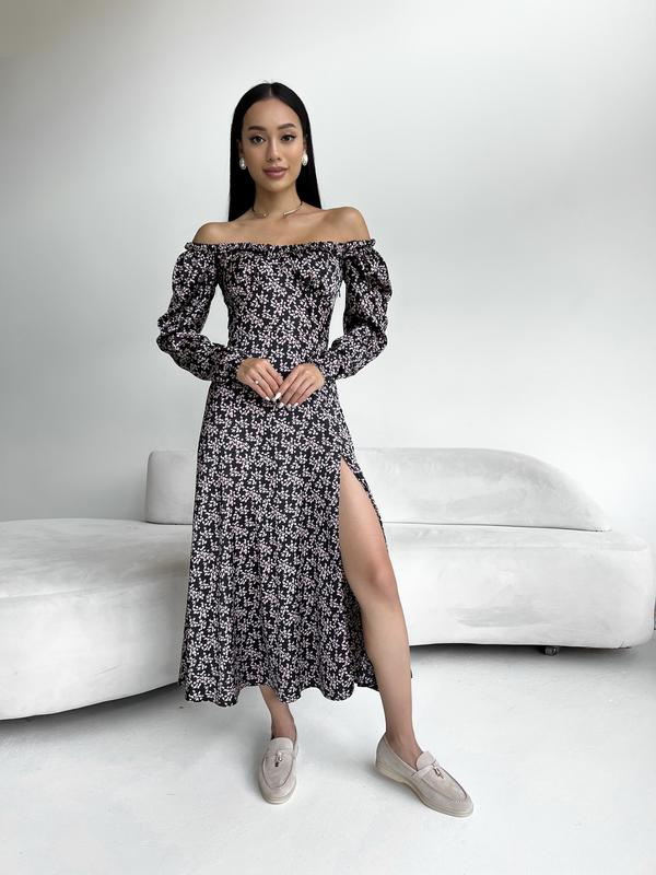Шелковое миди платье с открытыми плечами приталенное миди платье с разрезом