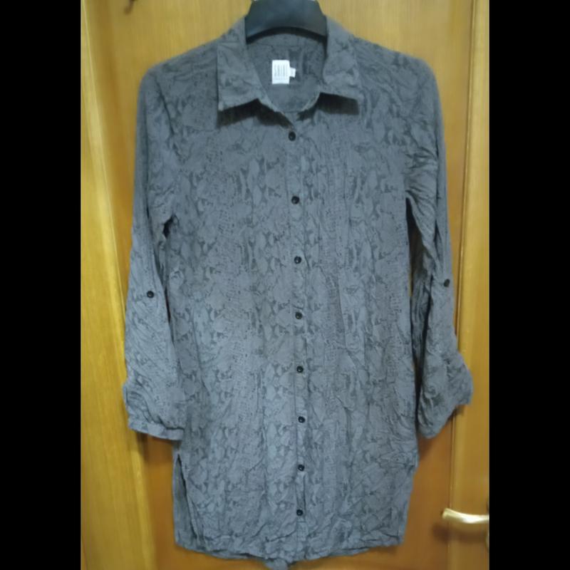 лёгкая серая- рубашка.покраска создаёт впечатление что она типа гепюра в сетку с узором.а это покраска такая воротник рубашечный.застежка тоже как рубашка с верху до низу.крлй прямой свободный.сзади на смене планка едва заметная.рукава внизу по собраны гармошкой в узкие манжеты.рукава можно подворачивать в короткие для застёжки на пуговку ! ткань-100% вискоза.страна- Дания.размер*S* замер:39- плечи тянутся*46- грудь+*86- длина*56- рукава- возможность поворота на пуговку*18- низ разрезов по бокам.