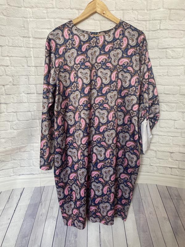 Платье миди, ткань имеет состав хлопка, вискозы и полиэстра. Имеет карманы, рукав закатывается и придерживается лямкой на пуговице. На спине имеет замочек для легкого одевания. Замеры: ОГ 108 см. ОТ 112 см. Длина 90 см. Длина рукава 53 см.