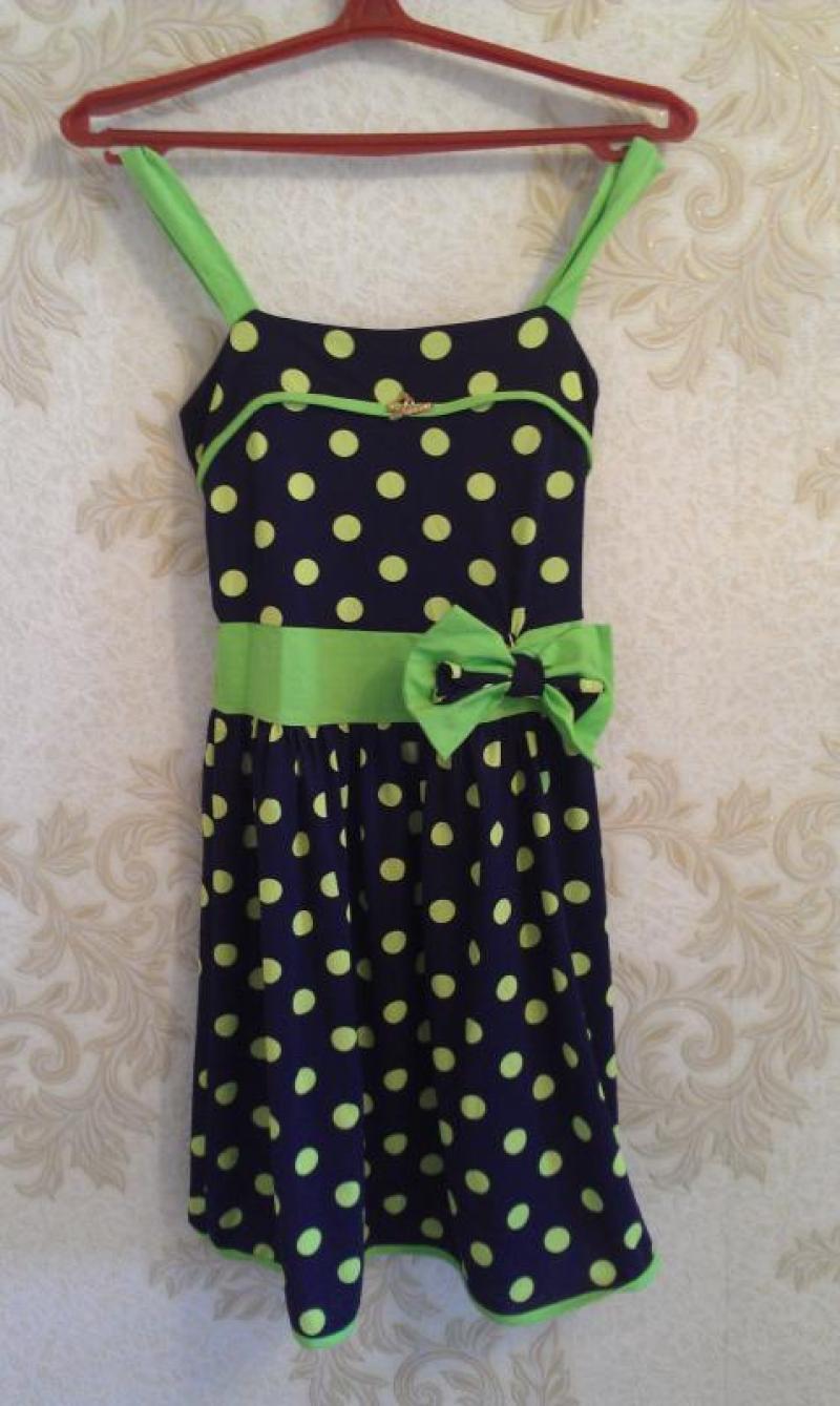 Новый яркий летней сарафан, темно-синего цвета в салатовый горошек. Бантик отстегивается . Длина 84. талия 53 Плечи 33