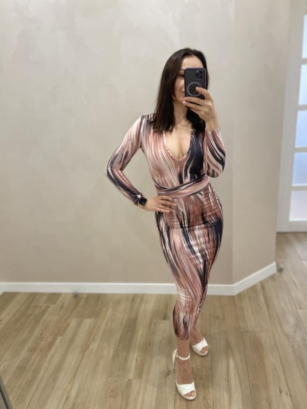Красивое облегающее платье, очень приятная ткань, на поясе пришиты завязки, которые можно завязывать и спереди, и сзади