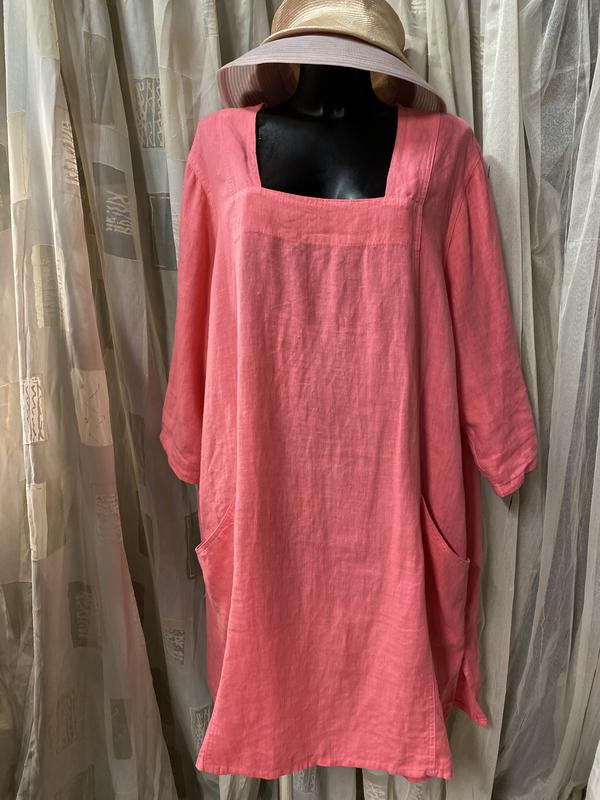 Красивый цвет. Модель оверсайз, два больших кармана, рукава до локтя, по бокам разрезы. Склад:льон-100/. Размер по наборе-3. Замеры: длина-102 см, ПОГ-67 см, ПОБ-74 см,