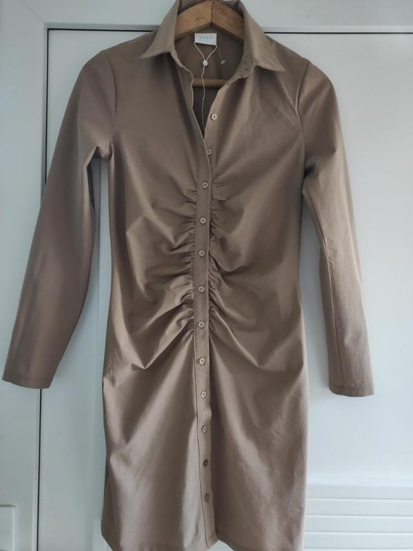 Платье-рубашка цвета кофе с молоком.Пог-47.Пот42.Поб-48.Длина изделия-85.Длина рукава от шеи-68.Ширина спинки-35.В идеальном состоянии.