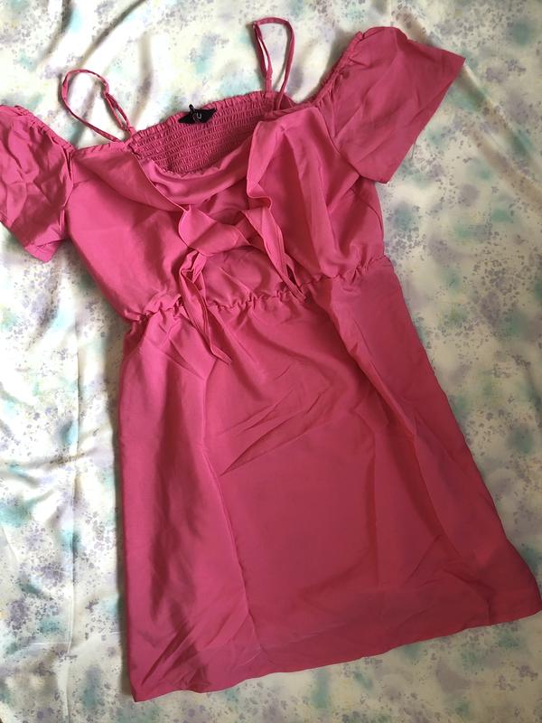 Яркое розовое платье. Идеальное состояние. Впереди двойная ткань, одна из которой вяжется на бант. Хорошо тянется верх. Брители регулируются.