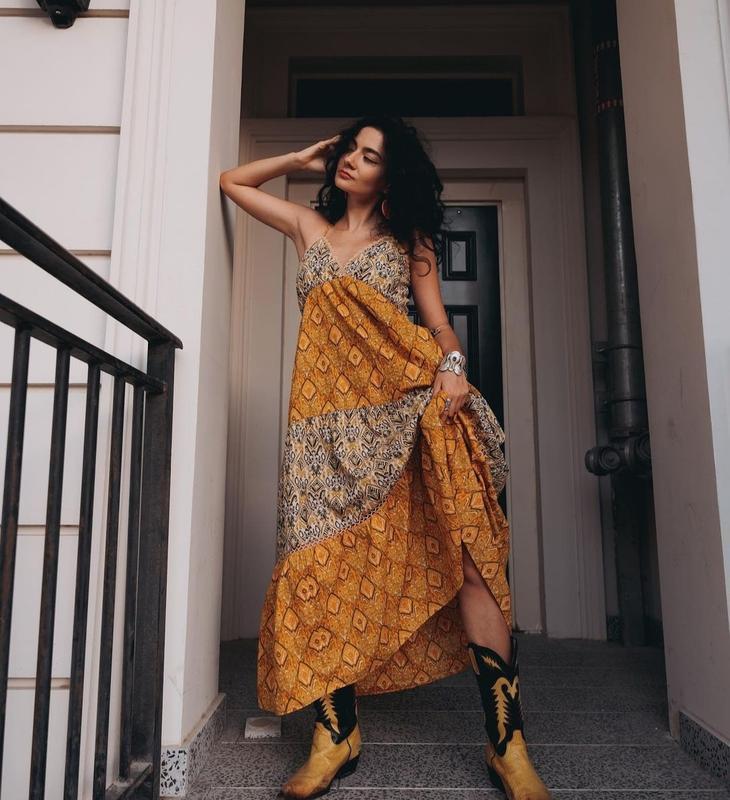 В НАЯВНОСТІ РОЗМІР: S та М ЗАМІРИ РОЗМІР S п.о. груди: 48см перед чашка 25см спина регулюється завязками п.о. талія: 39см тягнеться до 52 п.о бедра: 52см довжина сукні: 114см ЗАМІРИ РОЗМІР М п.о. груди: 54см перед чашка 28см спина регулюється завязками п.о. талія: 41см тягнеться до 53 п.о бедра: 55см довжина сукні: 118см СКЛАД ТКАНИНИ: ГОЛОВНА ТКАНИНА 100% БАВОВНА ПРИКРАСИ 100% ПОЛІЕСТЕР ПІДКЛАДКА 100% БАВОВНА Бавовняна сукня середньої довжини з V-подібним вирізом, тонкими бретелями та асиметричним ярусним низом.