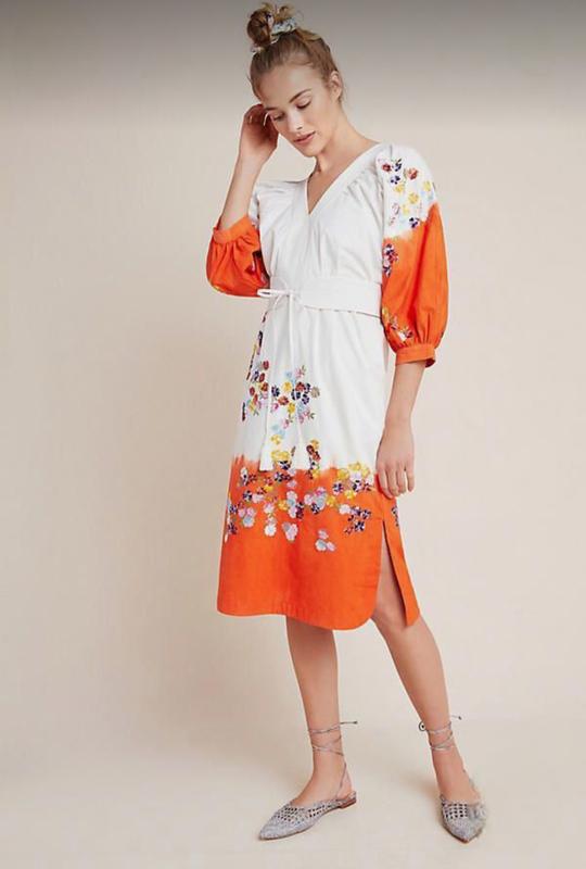Красивое платье из хрустящего хлопка на подкладке с вышитыми цветами, пишущими рукавами и боковыми разрезами.Размер 10.пояс отсутствует.