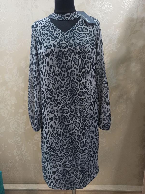 Плаття сукня міді, леопардовий принт сірий, з довгим рукавом на підкладі з декоративною горловиною, Sosandar. Розмір С-М. Заміри: ОГ 94, ОТ 90, ОБ 102, довжина рукава 61, довжина 100.