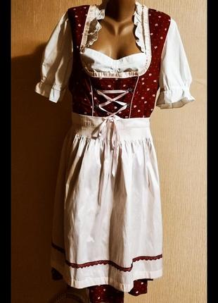 Платье Dirndl Landhaus голландского бренда C&A с блузкой и фартуком. Традиционное платье с цветочным принтом, короткими рукавами-фонариками на резинке. Верх на подкладке, отрезная талия, юбка в складку, застежка - молния сбоку. Шелковистый фартук украшен кружевом. Размер: 48. ПОГ - 52 см. ПОТ - 46 см. Плечи - 40 см. Рукав - 33 см. Длина - 103 см. Материалы: Платье - 100% коттон. Блуза - 65% полиэстер, 35% коттон. Фартук - 100% полиэстер.