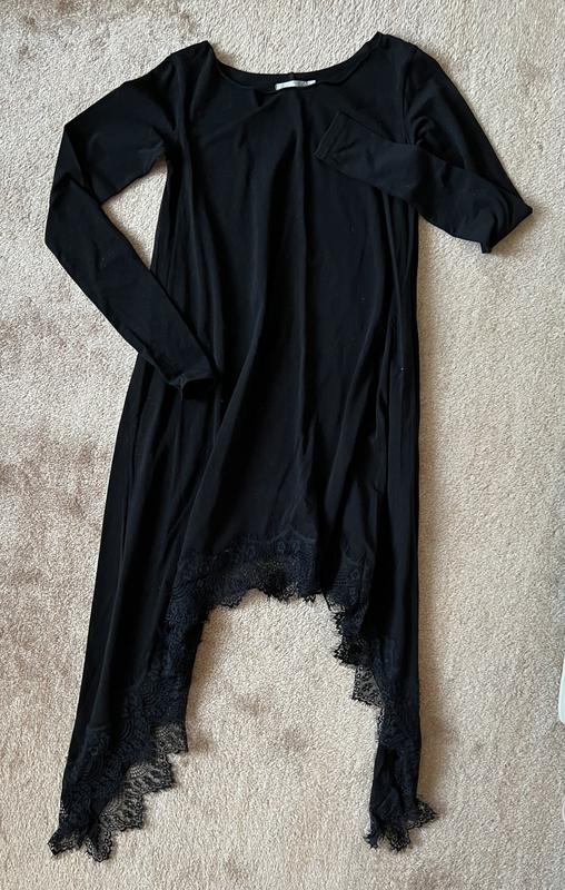 Легкое, удобное, коттоновое платье-лонгслив, свободного кроя, асимметричное, с нежным кружевом, Можно носить с поясом
