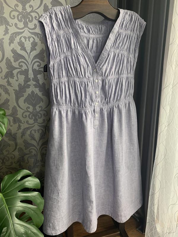 Это платье это одновременно и о комфорте, и о стиле, и о женственности. Бренд отсутствует, но платье самодостаточное и без производителя. Во-первых, это натуральная ткань (в составе 100% лен), во-вторых это актуальный крой, и длина миди, по-третьих это оригинальная драпировка верхней части ( фиксируется не резинками, а лентой, поэтому не тянется) и глубокий вырез декольте придают платья женственности. В боковых швах есть удобные карманы, по переду застежка на пуговицах. Нежный голубой- серый цвет с легким вкраплением белого. Платье в хорошем состоянии, без дефектов. Замеры: ширина в груди 96см, ширина в талии 94см, длина от линии талии 68см, длина общая 110см.
