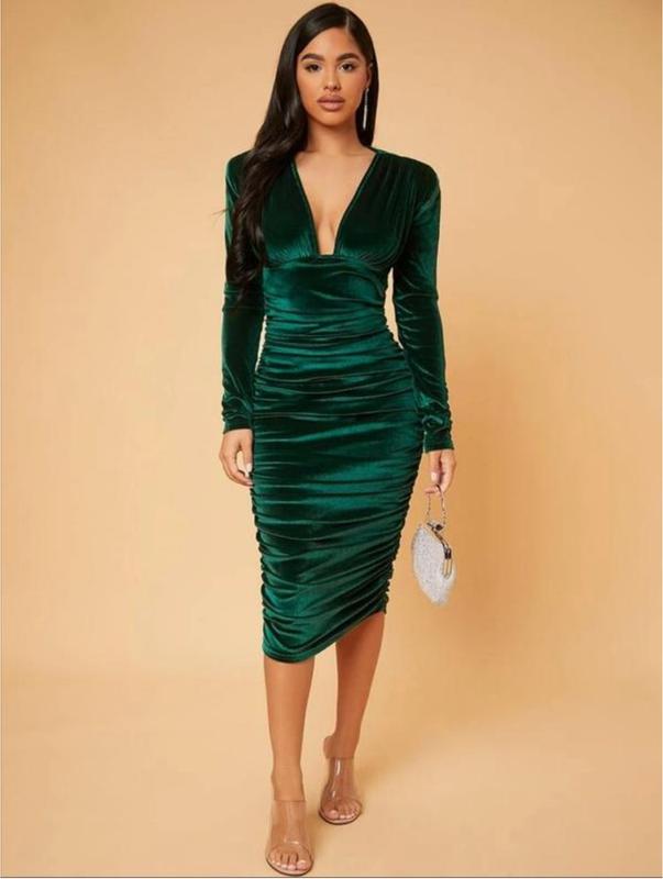 Шикарне смарагдове плаття з V-подібним вирізом від відомого бренда Shein 🥰 Розмір вказаний: M НОГ ~ 42 см ПОТ ~ 34 см НОС ~ 42 см Довжина рукава від плеча ~ 63 см Довжина ззаду в центрі спинки ~ 107 см Заміри зроблені в спокійному стані, не розтягуючи 🤗 Склад: 🌟 95% polyester 🌟 5% elastane За додатковою інформацією — пишіть, буду рада допомогти 🙂