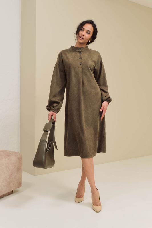 Материал - замш диагональ Цвет- хаки Фурнитура - пуговицы Фасон - прямой, свободный Сезон - демисезон, весна, осень Декоративные элементы - планка, низ рукава на резинке Конструктивные элементы - планка-складка Комплектация - платье, пояс Уход за одеждой ручная стирка до 30° Длина изделия S-M = 106 см, L-XL = 108 см, XXL-3XL = 109 см. Длина рукава S-M = 53 см, L-XL = 53 см, XXL-3XL = 53 см