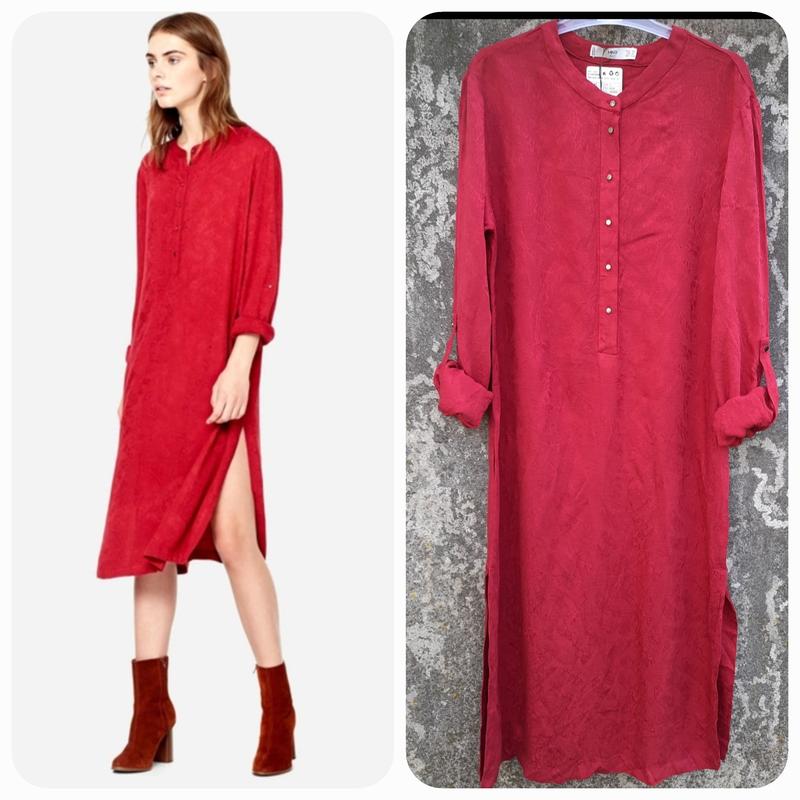 EUR XS Сукня туніка від Mango. Неймовірна легка і приємна. Тканина: 100% віскоза ( жаккард). Ґудзики розстібаються. Заміри: - між плечима 40.5 см - під рукавами 44 см - Довжина рукава ( повна,без підкочування)від плечового шву 57 см - Ширина в талії 44 см - Ширина в стегнах 48 см - Довжина по спині по центру 102 см Колір темно- червоний. На вулиці яскравіший,як видно на фото. На одному рукаві по шву (близько 4 см) схоже,що був невеликий ремонт. Непомітно зовсім,майже впритул. Схоже,що сшито було виробником слабо,тому підшито. За запитанням фото зроблю. Відправка Новою поштою 2-3 рази на тиждень. Укрпошта раз на тиждень. Накладений платіж можливий тільки Новою поштою з передоплатою за доставку в обидві сторони.