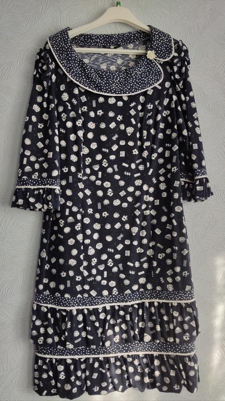 Очень красивое женское платье, производство Беларусь, темно синего цвета, шикарный состав ткани. Настоящий цвет камера телефона не передает. ПОГ - 52, ПОБ - 53, плечи - 41, длина - 102. Рукав 3/4 - 46, возле плеча присборен. Воланы двойные. Очень изысканный фасон. Платье просто классное.