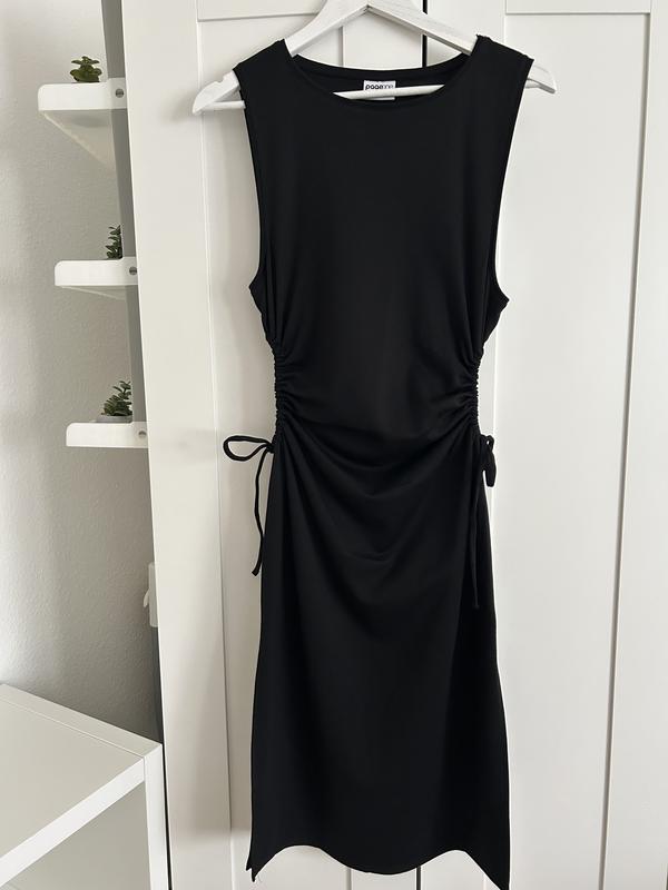 Платье из плотного трикотажа, держит форму! Можно под топ или футболку , на талии по бокам вырезы- можно регулировать шнурком? Длина по спинке 108 см, пог- 46 см ( тянется), поб - 47 см- тянется
