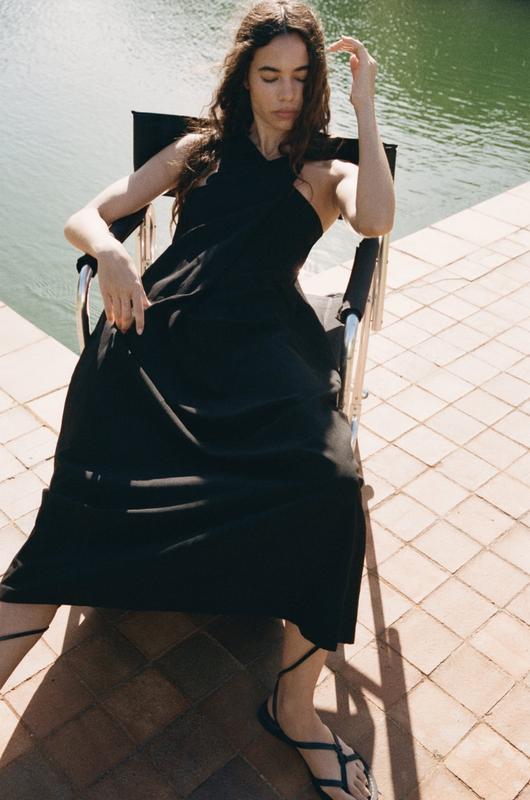 Платье средней длины с перекрещенным верхом, регулируемыми бретелями и боковыми карманами в шве, выполнено из смесовой льняной ткани. Застегивается на скрытую молнию сбоку. Cклад: 54% вискоза, 24% хлопок, 22% лен. По бірці М-ка. Лучше будет на L-XL.