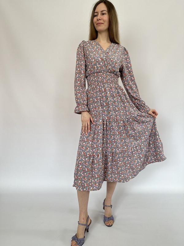 Платье весеннее длинное миди треугольный вырез жатка на талии с м л с принтом в цветы