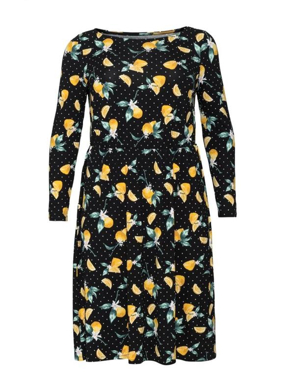 Яркое платье с принтом фруктов. Талия отрезная, под резинку. Ткань мягенькая, эластичная. ✔️ плечи 37 ✔️ ПОГ 55 ✔️ ПОТ 47(55) ✔️ ПОБ 62 ✔️ длина рукава 62 ✔️ длина 112 Состояние идеальное.