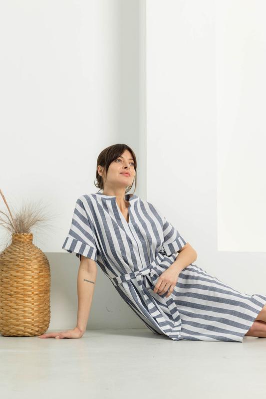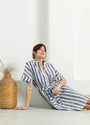 Материал - лен Цвет - синий Принт - полоска Фасон - прямой Сезон - лето Конструктивные элементы - приспущенный рукав Комплектация - платье, пояс Уход за одеждой ручная стирка до 30° Длина изделия S-M = 111 см, L-XL = 113 см, XXL-3XL = 115 см.