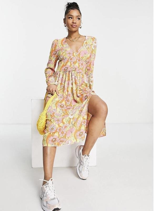 Платье миди Monki с v-образным вырезом и длинным рукавом в цветочном стиле в стиле ретро Пог 56 пот 44 (позади резинка тянется )поб свободный,длина 117 рукав 64