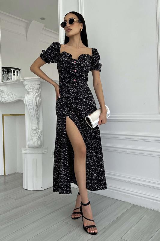 Тканина: принтований софт, Состав: 60% полиэстер, 38% вискоза, 2% эластан; Цвет: черный Размер: S, M, L Фактические замеры изделия: Объем по груди: S-88; M-92; L-96; Объем по талии (платье): S-68; M-72; L-76; Объем по бедрам: S-94; M-98; L-102; Объем рукава сверху: S-44; M-44,5; L-47; Длина изделия по спинке: S-115; M-115; L-115; Длина изделия до талии: S-25; M-25; L-25; Длина юбки: S-90; M-90; L-90; Длина рукава: S-31; M-31; L-31; Длина рукава по внутреннему шву: S-10; M-10; L-10; Модель украшает фигурный вырез и оборка по лифу, подчеркивающую зону декольте. Короткий рукав-фонарик с эластичной манжетой. Длинная юбка а-силуэта подчеркивает линию талии. Сбоку предусмотрен небольшой разрез.